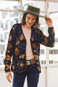 100 Alpaca Black Cardigan Sweater with Floral Motif 'Evensong Bloom' Item ID: 2669904572