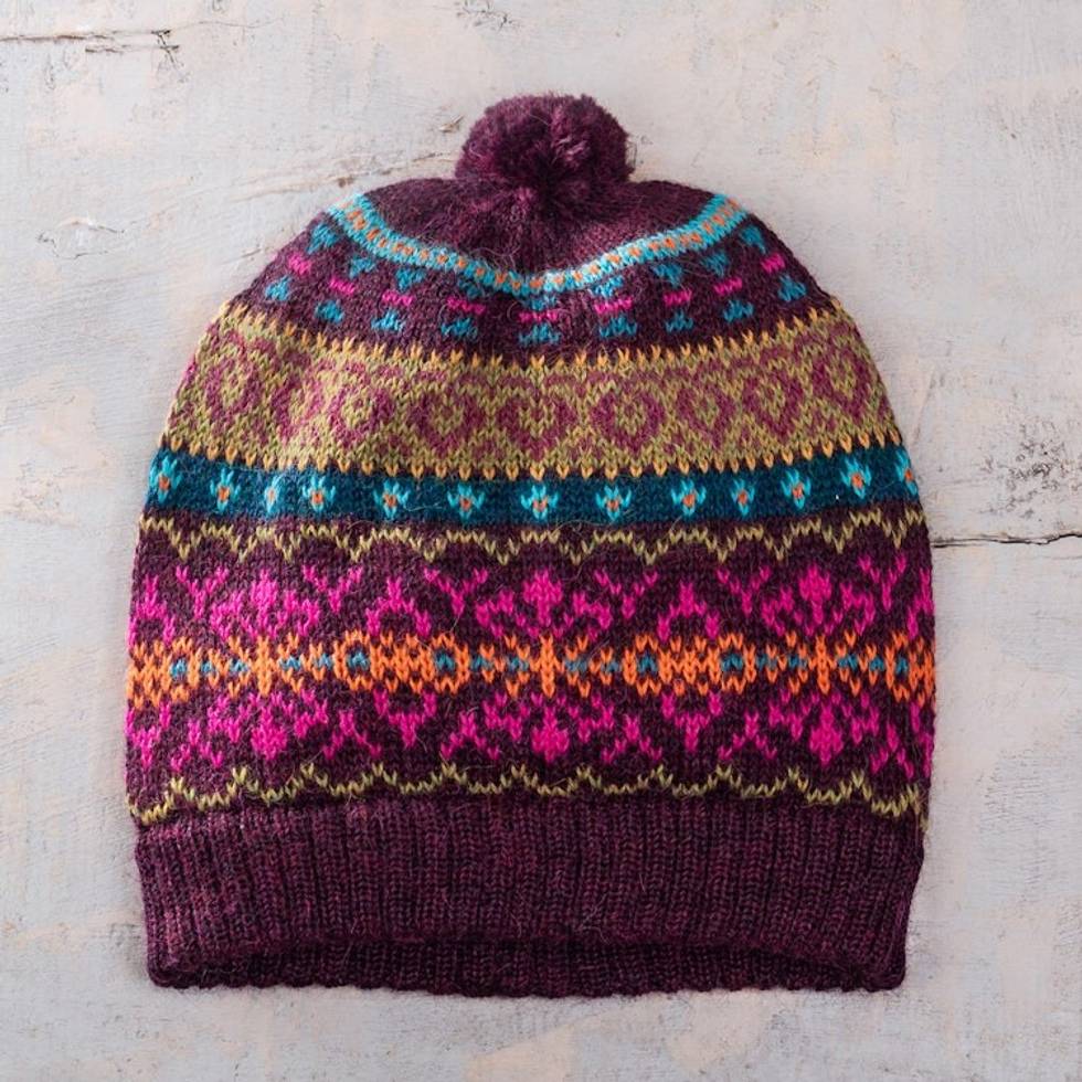 100 Alpaca Knit Hat in Purple with Pompom and Andean Motifs 'Inca Pompom' Item ID: 2671400571