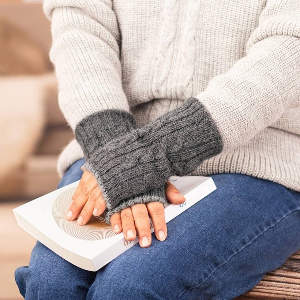 100 Alpaca Knit Reversible Fingerless Mittens in Grey Hues 'Smoke and Graphite Glam' Item ID: 2671698164