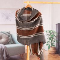 100 Alpaca Shawl in Grey Orange with Stripes and Fringes 'Striped Glamor' Item ID: 2671224770
