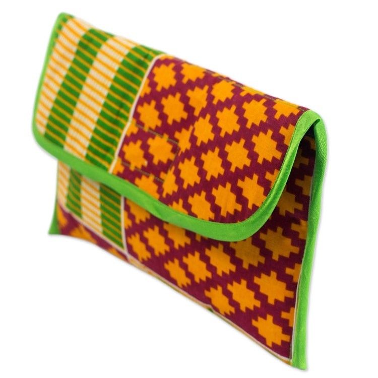 "Ghanaian kente motifs in saffron, light red, lime, and cool white are featured on the surface of this handbag, crafted from 100% cotton. The designs are by artisan Hannah Dodoo, who trains other women in her community in order to help them rise above unemployment. The clutch opens with a velcro flap and a zipper to reveal a nylon lining in black."