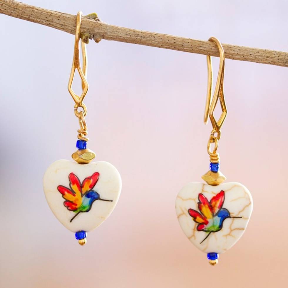 14k Gold-Plated Howlite Dangle Earrings with Rainbow Birds 'Fluttering Joy' Item ID: 2669932064