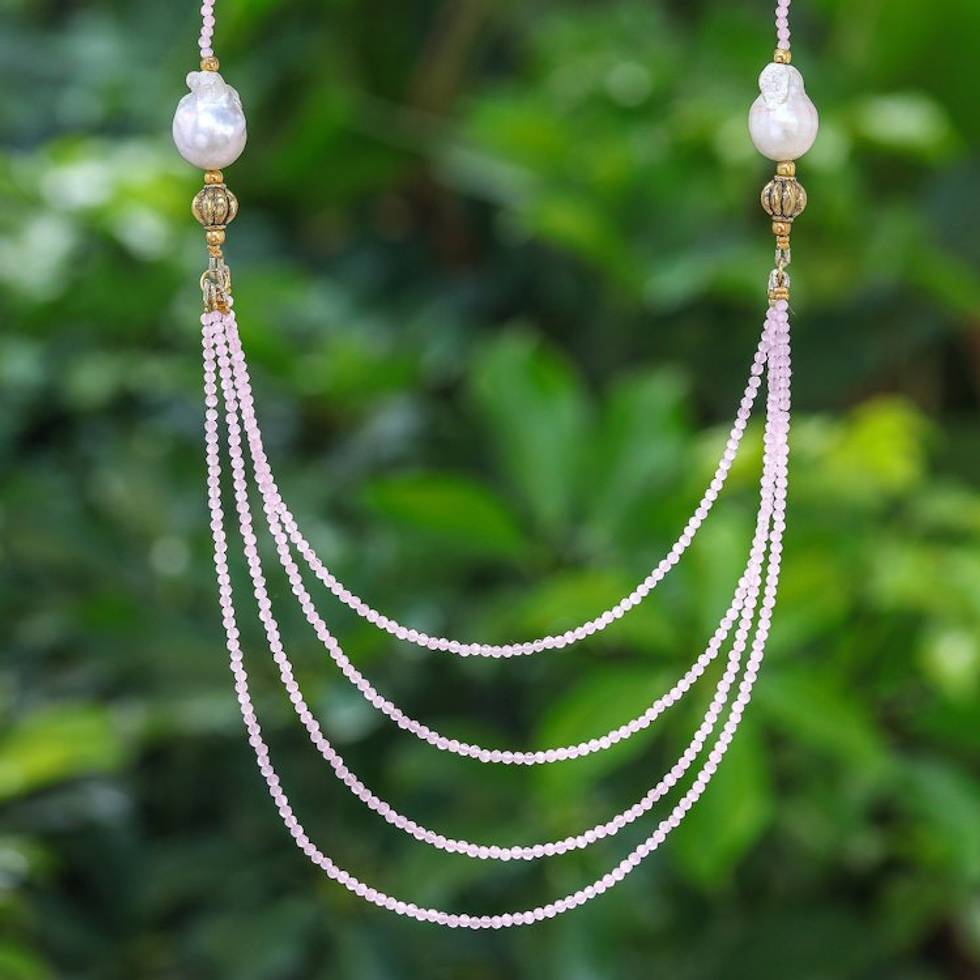 "Thailand's Arshad Ullah brings us his newest design featuring glamorous rose quartz stones and white cultured pearls for a glowing touch. With four strands of charming beads, this unique piece of jewelry also features 18k gold-plated brass accents that allow the accessory to complement any outfit."