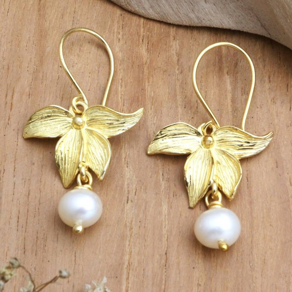 18k Gold-Plated Floral Dangle Earrings with Cultured Pearls 'Floral Gold' Item ID: 2669921260