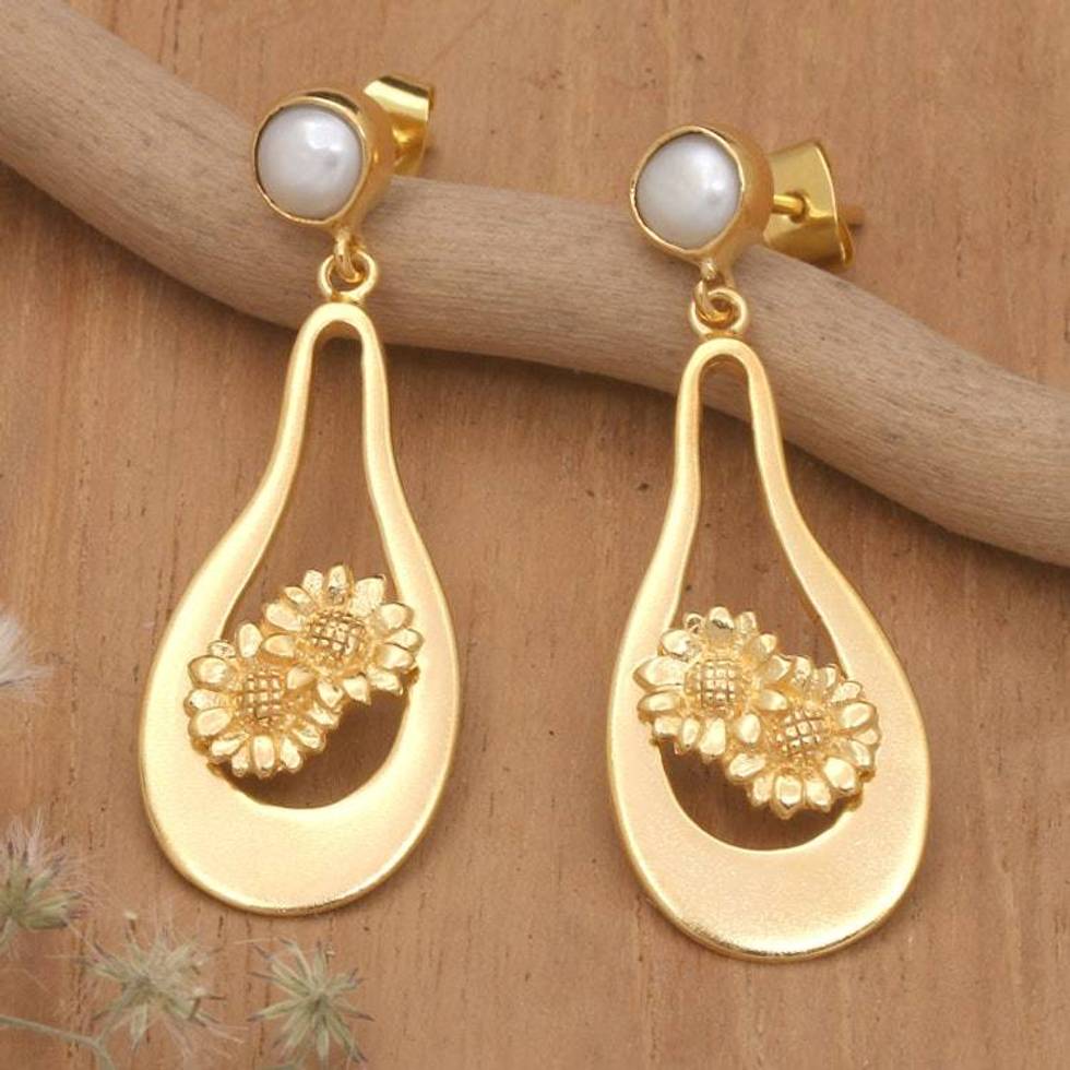 18k Gold-Plated Floral Grey Cultured Pearl Dangle Earrings 'Together in Spring' Item ID: 2676659704