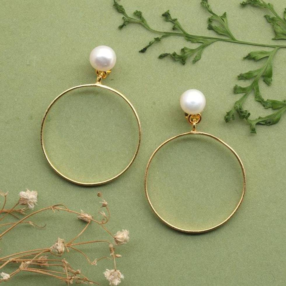 18k Gold-Plated Round Cultured Pearl Dangle Earrings 'Cycles of Bali' Item ID: 2676659757