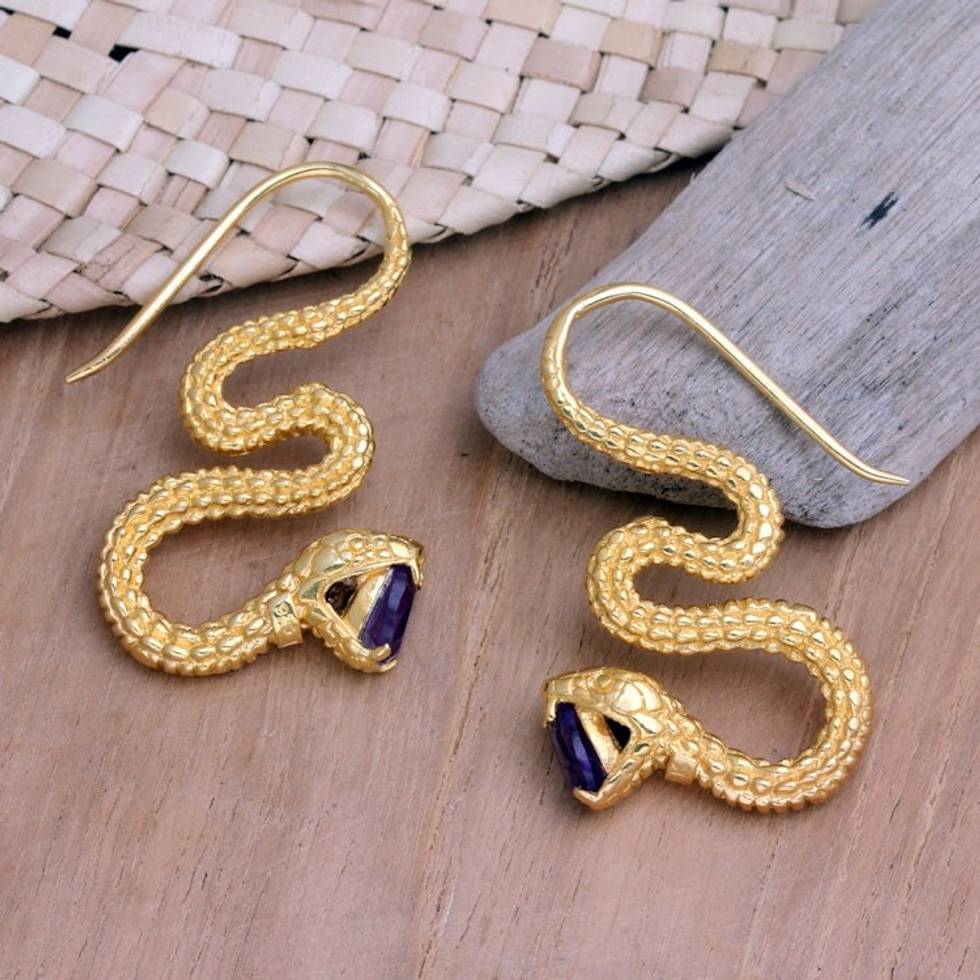 18k Gold-Plated Snake Drop Earrings with Faceted Amethyst 'Purple Striking Snake' Item ID: 2671747770