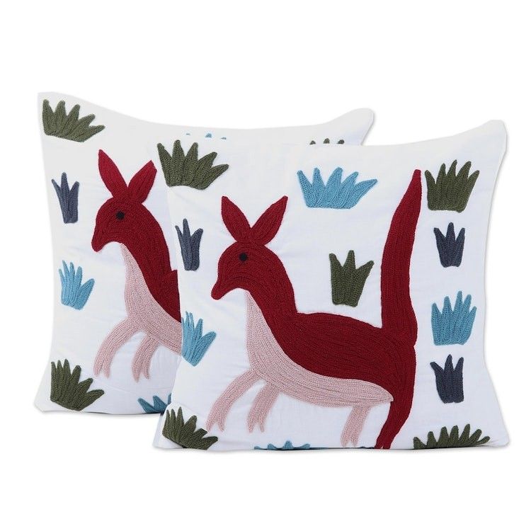 2 Aari Embroidery Folk Art Kangaroo Cotton Cushion Covers 'Joyful Joey' Item ID: 2671792882