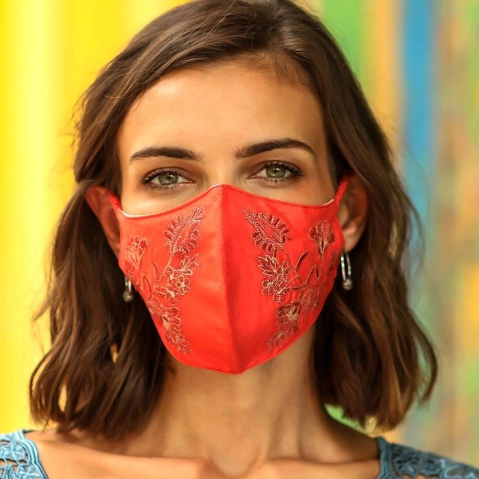 2 Beaded Embroidered Cotton Face Masks in Orange and Pink 'Balinese Glamour' Item ID: 2671744781