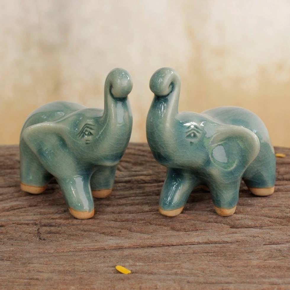 2 Blue Celadon Ceramic Handcrafted Lucky Elephant Figurines 'Lucky Blue Elephants' Item ID: 2669892425