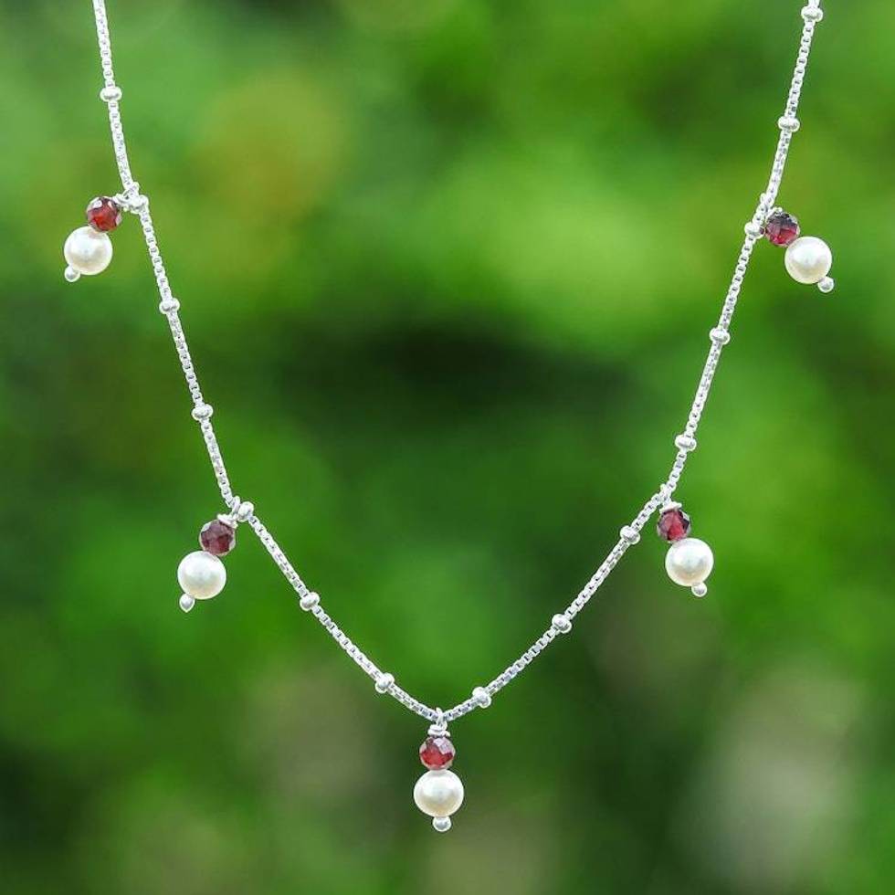 2-Carat Garnet Cultured Pearl Silver Charm Station Necklace 'Fiery Luster' Item ID: 2676653314