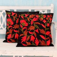 2 Chainstitch Embroidery Black Cotton Floral Cushion Covers 'Poppies at Midnight' Item ID: 2669925489