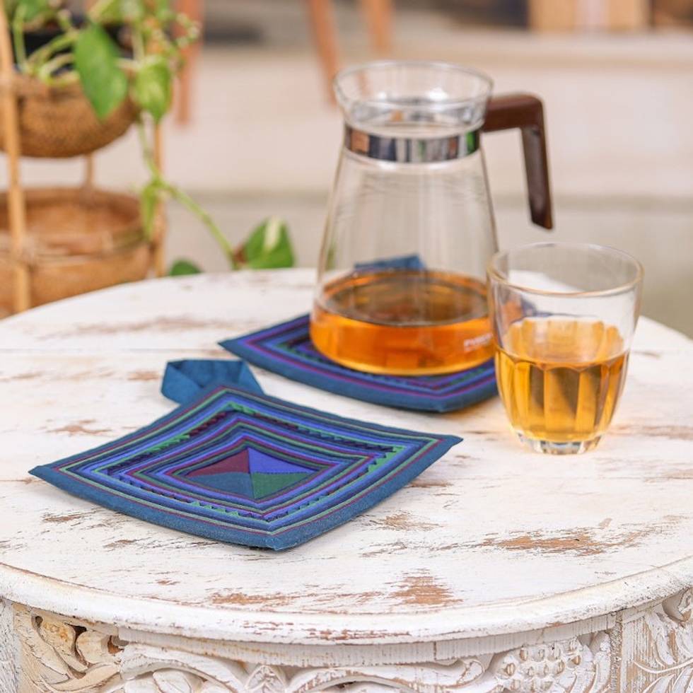 2 Cotton Blend Trivets with Lisu Hill Tribe Applique Work 'Lisu Cooking in Blue' Item ID: 2671796615
