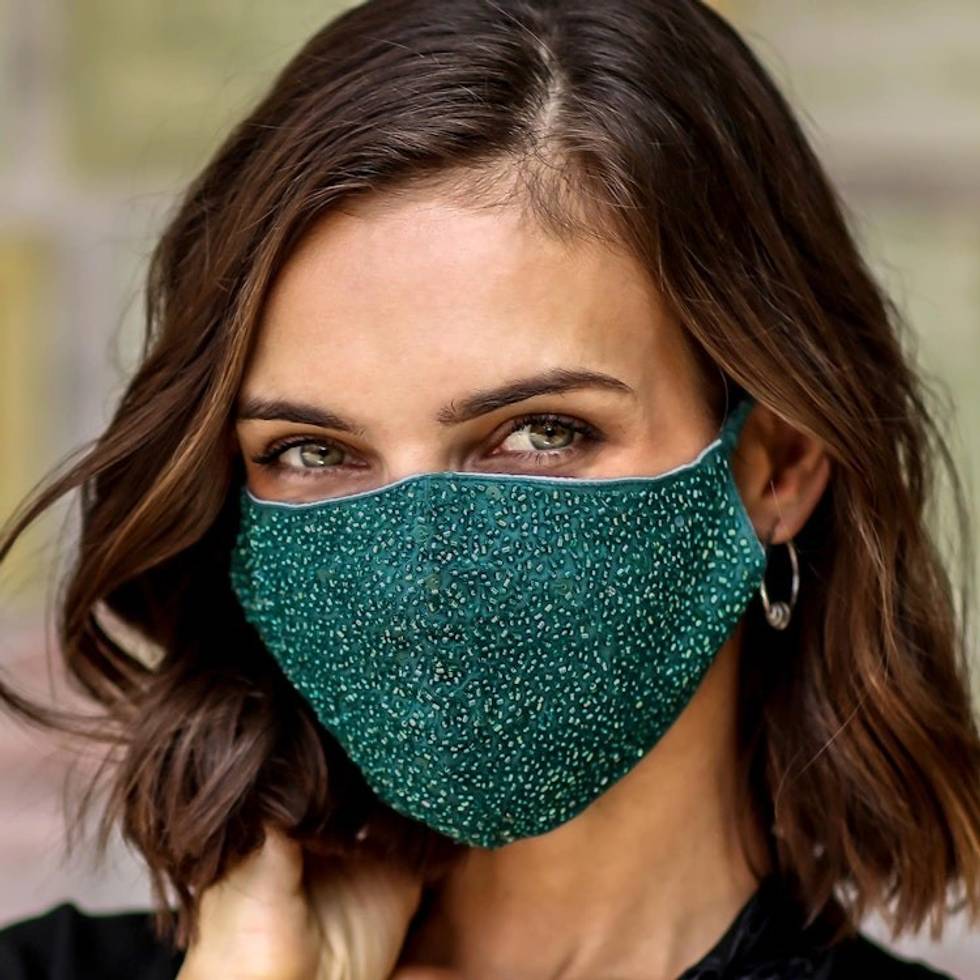 2 Hand Beaded Cotton Contoured Masks in Green and Orange 'Feeling Glamorous' Item ID: 2671744801