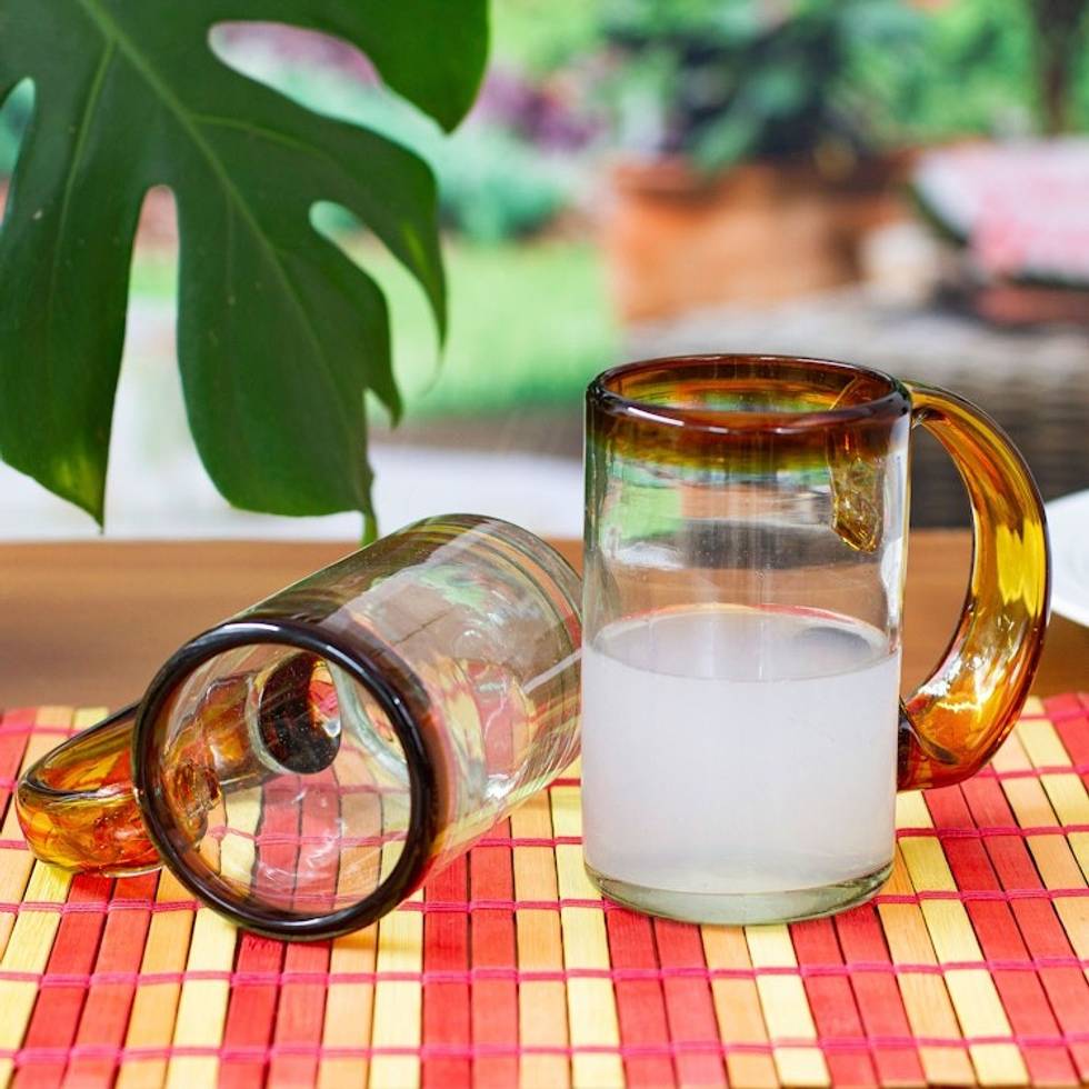 2 Hand Blown Recycled Beer Glasses with Amber Handle and Rim 'Amber Beer' Item ID: 2669897968