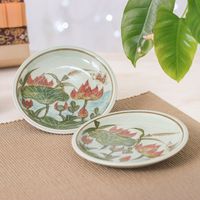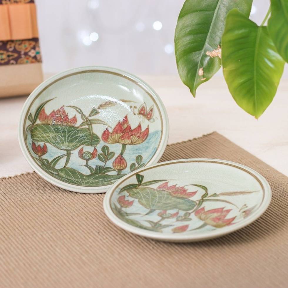 2 Hand-Painted Celadon Ceramic Floral Leaf Dessert Plates 'Lotus Flower Delight' Item ID: 2671797225