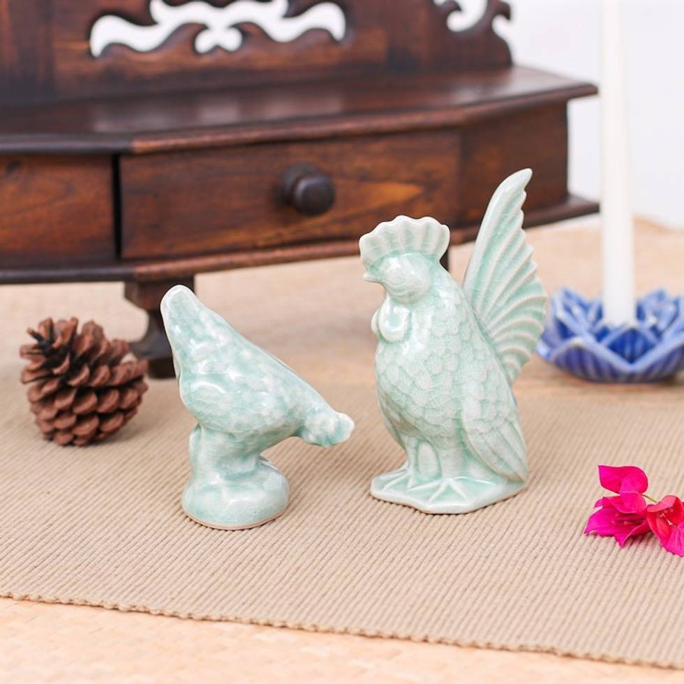 2 Handcrafted Green Celadon Ceramic Rooster Hen Figurines 'Japanese Rooster Hen' Item ID: 2671797967