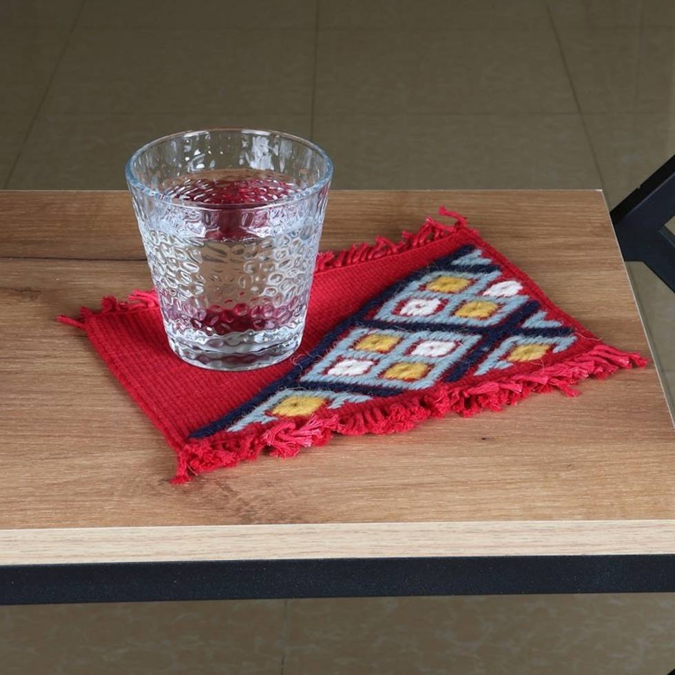 "Meticulously hand-woven using cotton and adorned with exquisite wool hand embroidery, this pair of red coasters not only add a touch of elegance to your dining table but also serve as charming decorative accents for your favorite tabletops and surfaces. They are crafted through the weaving techniques used for making the traditional shulal rugs from the Tavush region in Armenia, which has a long-standing reputation for its exceptional carpet weaving, embroidery and lacemaking. Hasmik Margaryan incorporates innovative ideas and contemporary styles into the lovely fringed coasters with their colorful geometric motifs in shades of grey, yellow, white, and black."