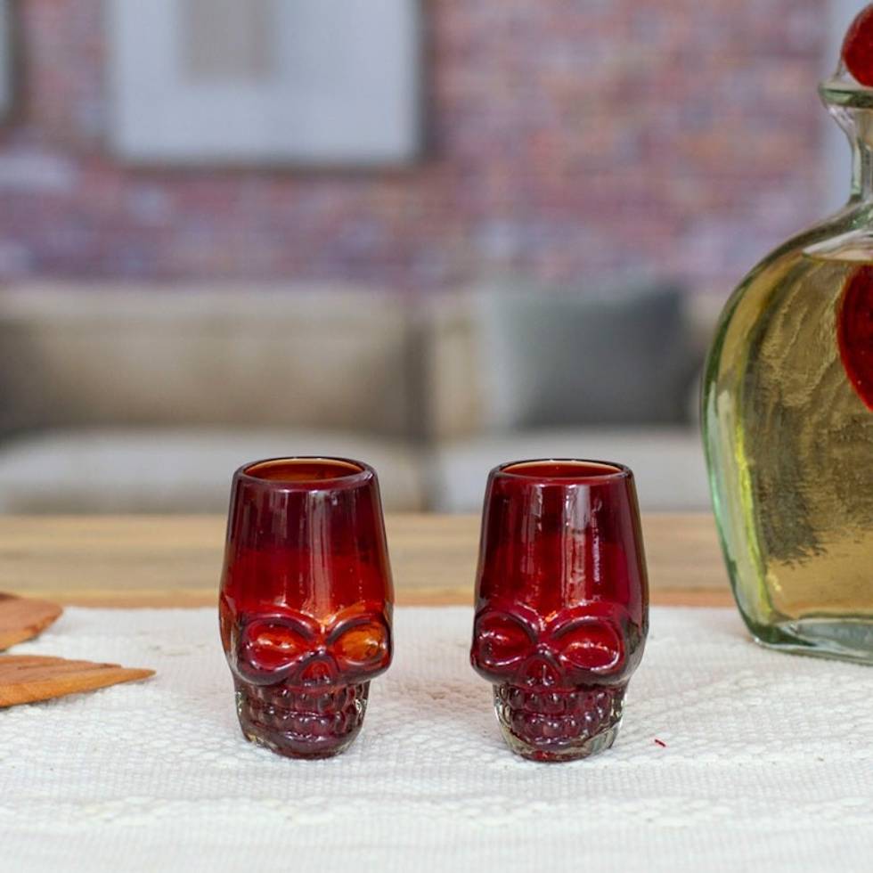 2 Red Skull-Themed Handblown Recycled Glass Tequila Glasses 'Red Mexican Skull' Item ID: 2671800637