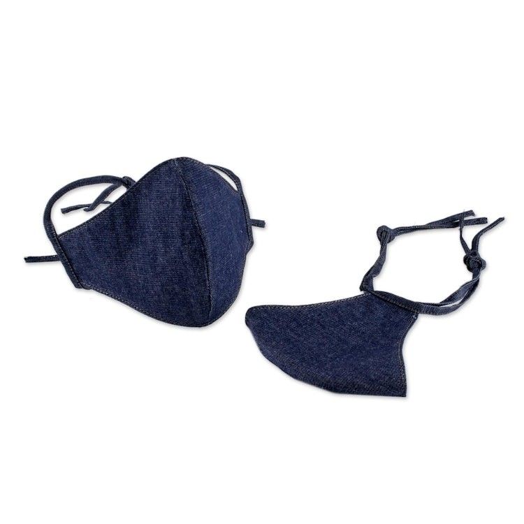 2 Ties-On Dark Blue Cotton Denim 3-Layer Unisex Face Masks 'Blue Denim Classic' Item ID: 2671776694