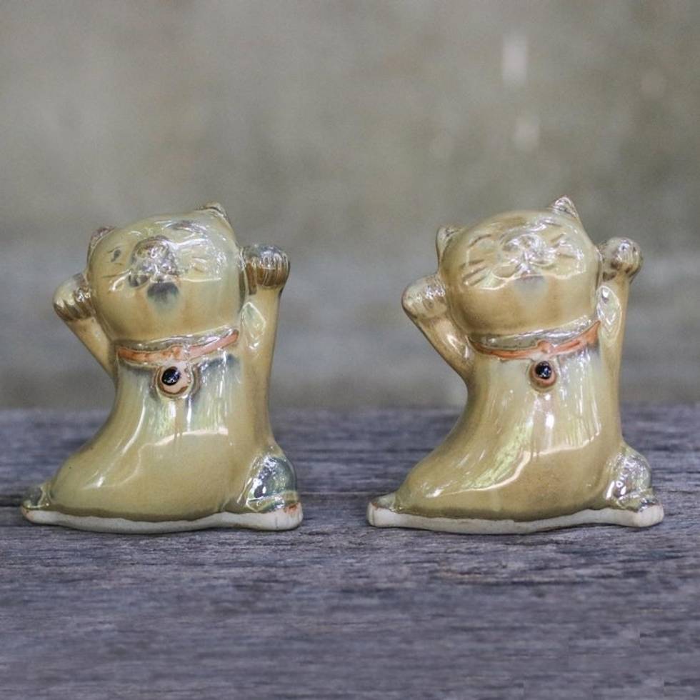2 Yellow Ceramic Lucky Cat Figurines Crafted in Thailand 'Playful Good Luck Cats' Item ID: 2671801325