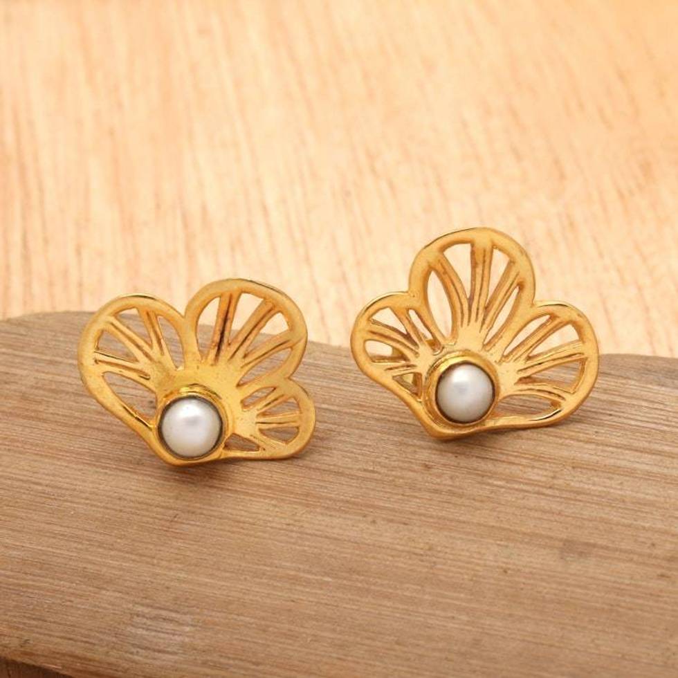 22k Gold-plated Cultured Pearl Clover Button Earrings 'Marine Clover' Item ID: 2676661388