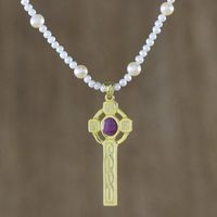 22k Gold Plated Cultured Pearl Purple Cross Necklace 'Faithful Soul in Purple' Item ID: 2671801371