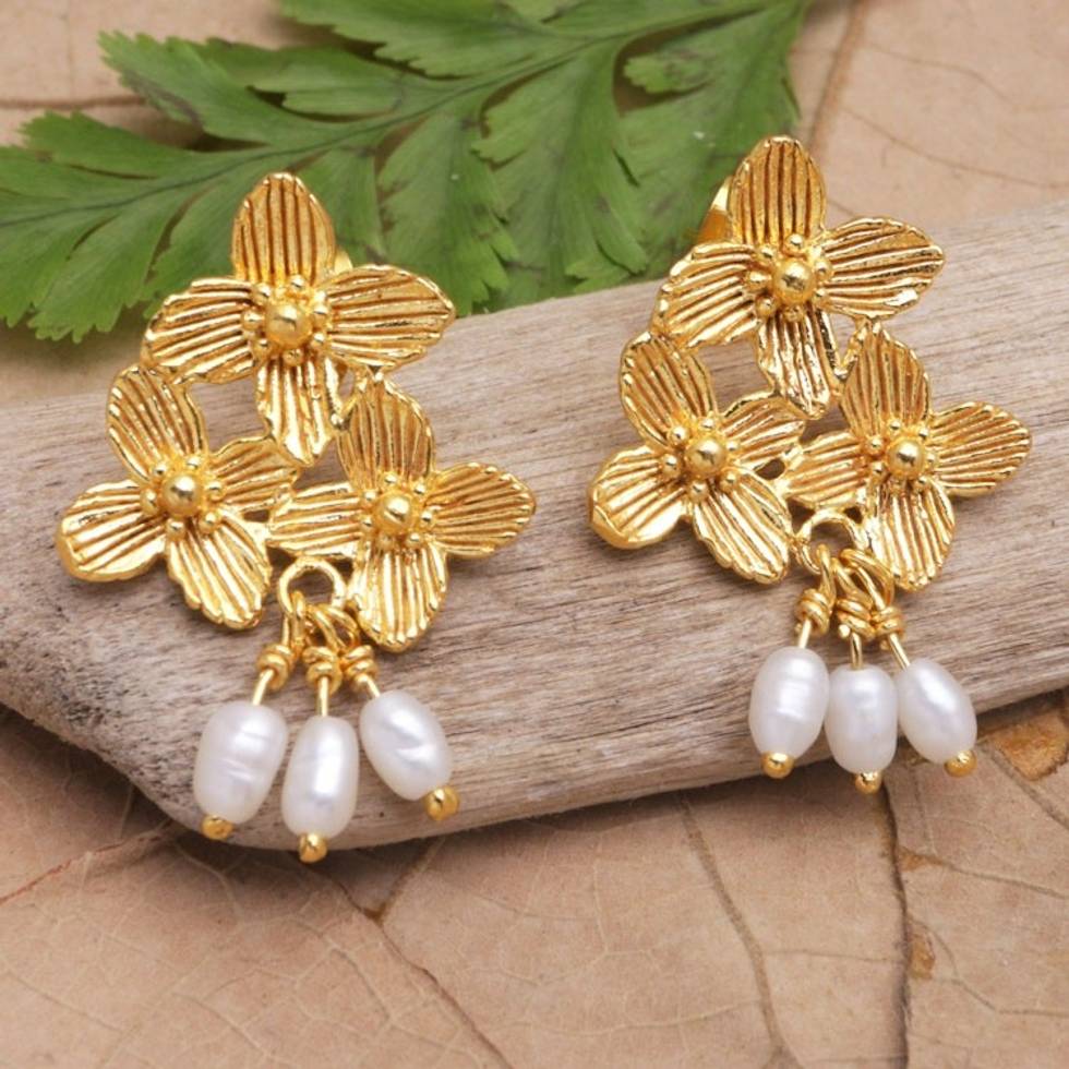 22k Gold-Plated Dangle Earrings with Cultured Pearls 'Blooming Trinity' Item ID: 2671747935