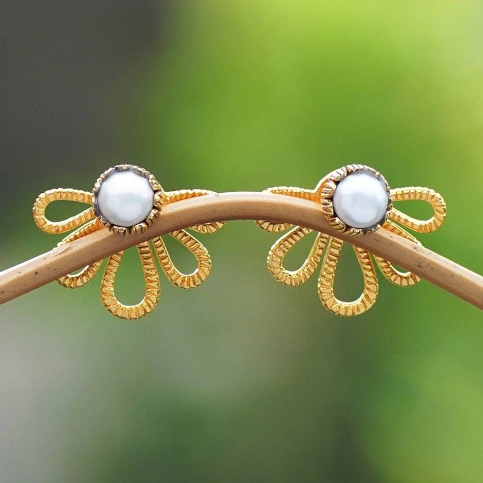 22k Gold-Plated Ear Jacket Earrings with Grey Pearls 'Gianyar Altar' Item ID: 2671763244