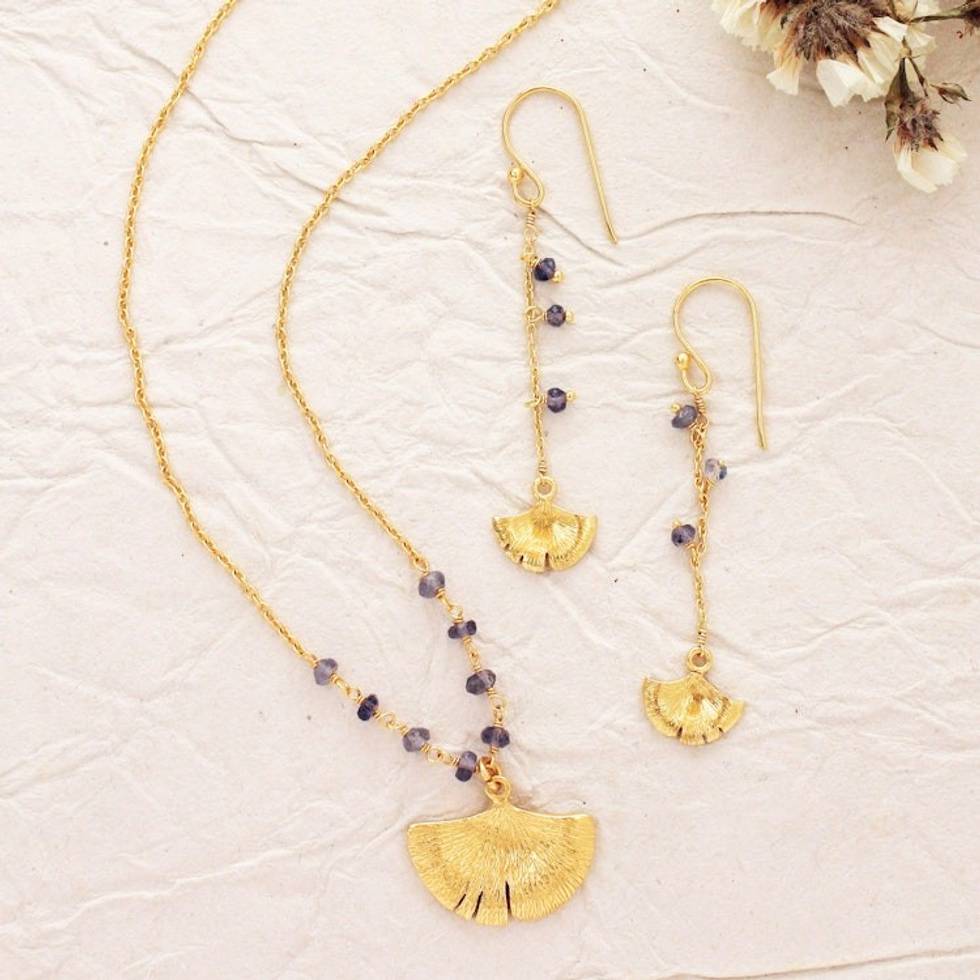 22k Gold-Plated Iolite Leafy Jewelry Set from India 'Golden Ginkgo' Item ID: 2669924609