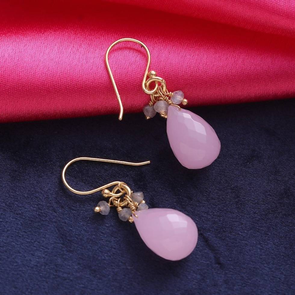 22k Gold Plated Rose Quartz and Labradorite Dangle Earrings 'Glittering Pink Drops' Item ID: 2671618645