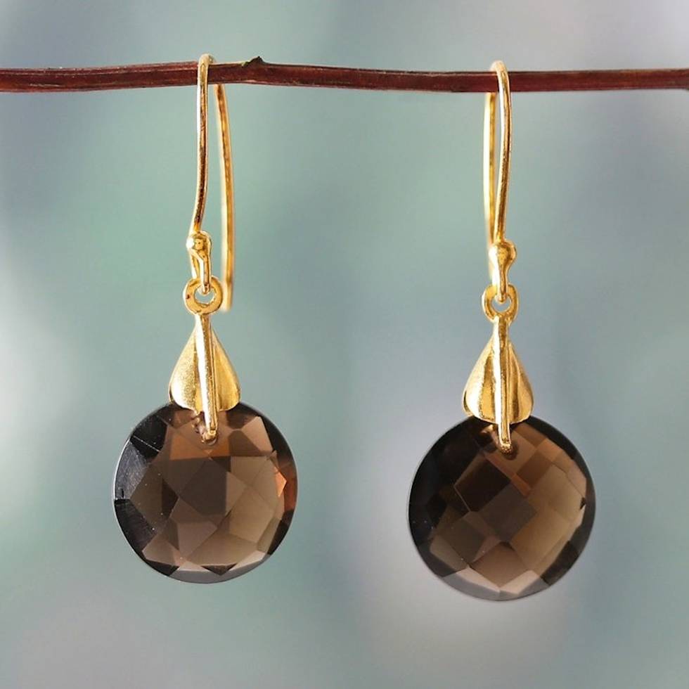 22k Gold-Plated Smoky Quartz Dangle Earrings from India 'Evening Dazzle' Item ID: 2671625189