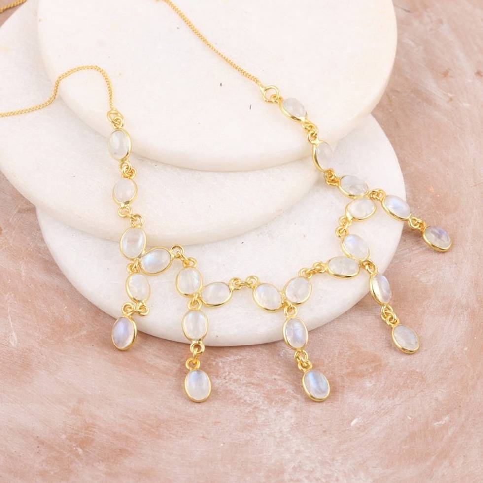22k Gold-Plated Waterfall Necklace with Rainbow Moonstones 'Creativity Drops' Item ID: 2671789034