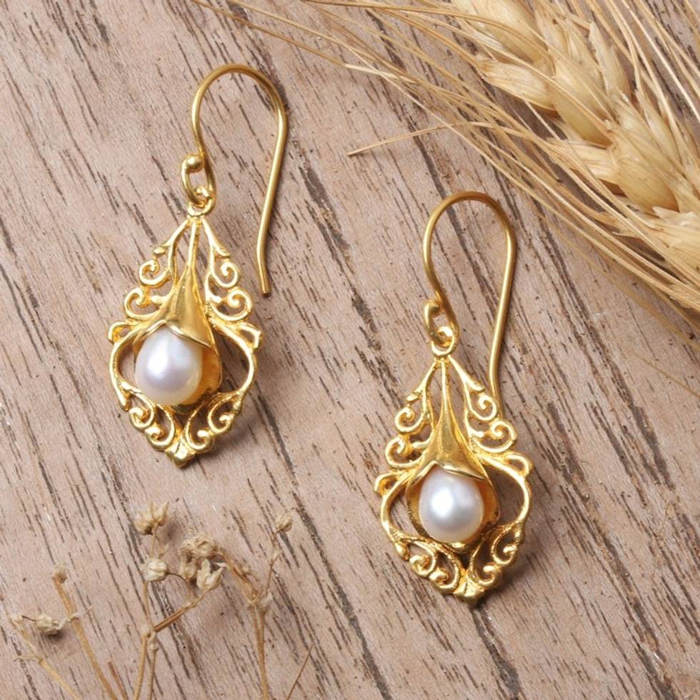 22k Gold-Plated White Cultured Pearl Kayonan Dangle Earrings 'Sacred Kayonan' Item ID: 2671669775