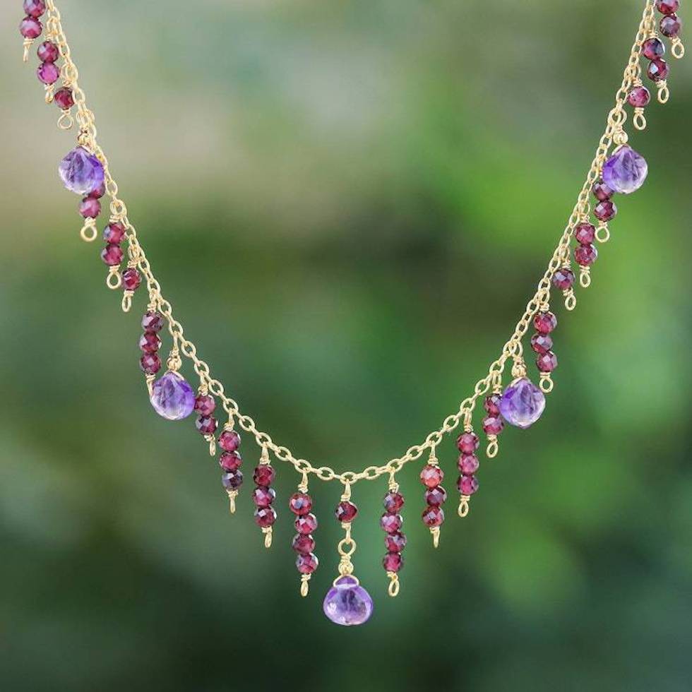 24k Gold-Plated Amethyst and Garnet Waterfall Necklace 'Stylish Rose' Item ID: 2676653358