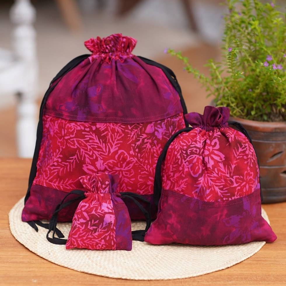 3 Upcycled Reusable Batik Drawstring Gift Pouches in Red 'Cheerful Red' Item ID: 2671671879
