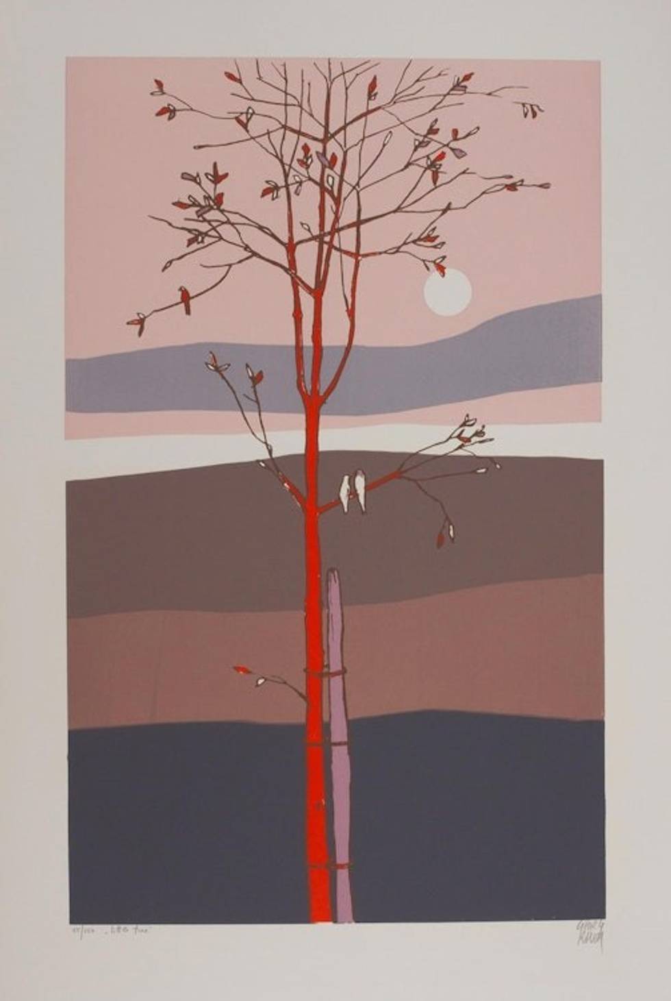 "Supported by a sturdy stake, a young tree begins to put out new leaves. The slender sapling is already home to small birds that perch on its branches. The tiny creatures seem to gaze toward the horizon in a beautiful signed and numbered silkscreen print by Georg Rauch. Mexico was a constant source of inspiration for artist."