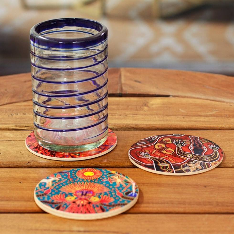 4 Decoupage Pinewood Coasters with Mexican Huichol Motifs 'Huichol Inspiration' Item ID: 2671638947