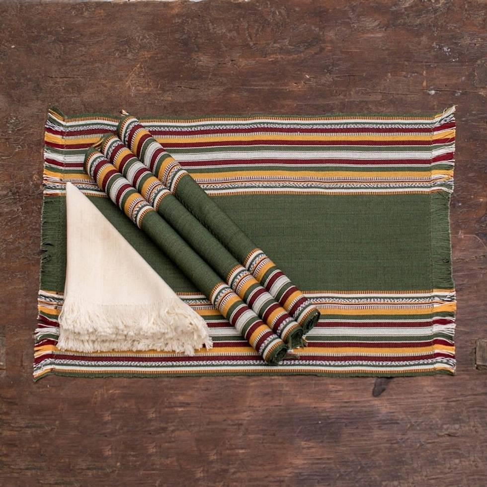 4 Hand-Loomed Striped Green Cotton Placemat and Napkin Set 'Palopo in Olive' Item ID: 2671769187