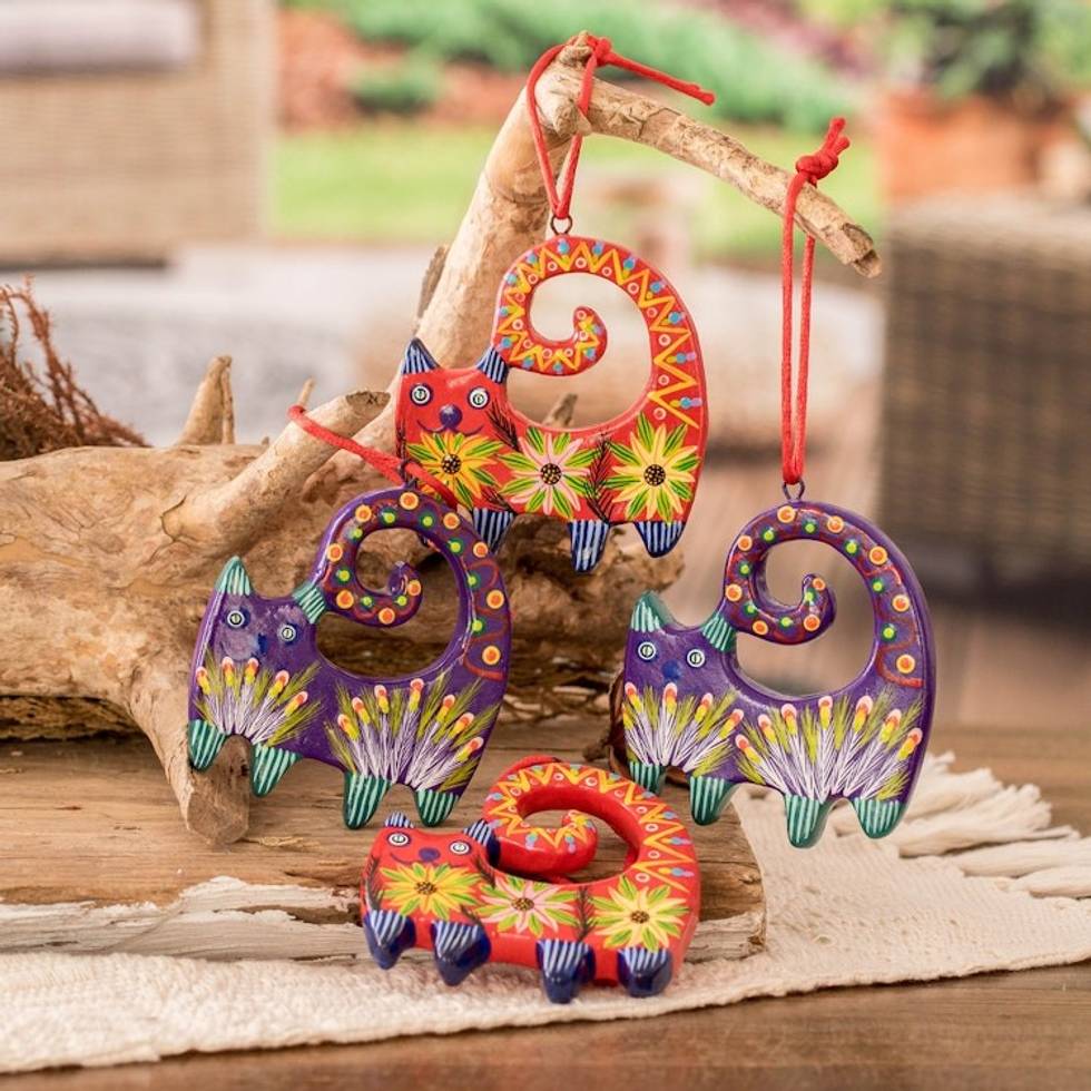 4 Hand-Painted Cat-Shaped Ceramic Ornaments from Guatemala 'Celebration Cats' Item ID: 2671768872