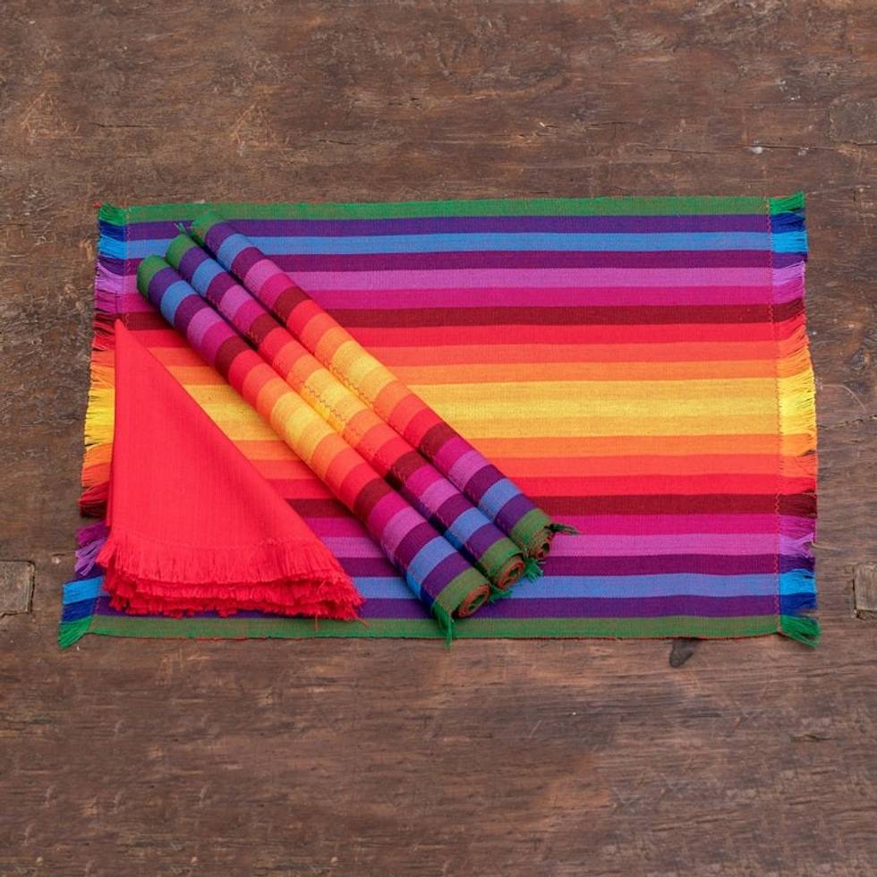 4 Handwoven Striped Cotton Rainbow Placemats with Napkins 'Palopo Rainbow' Item ID: 2671768982