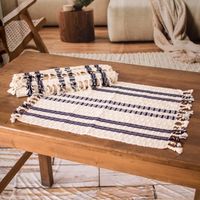 4 Ivory and Blue Handwoven Striped Fringed Cotton Placemats 'Splendid Contrast' Item ID: 2671769154