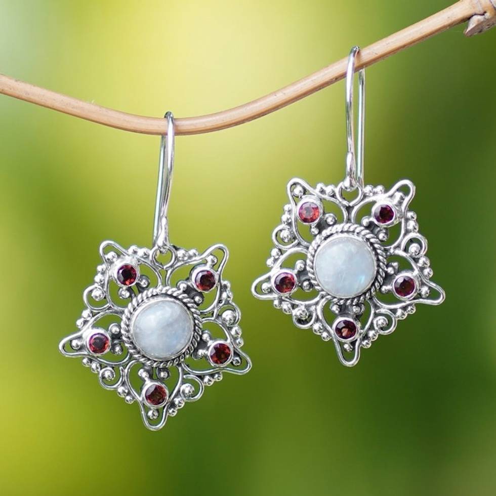 5-Carat Garnet and Rainbow Moonstone Star Dangle Earrings 'Starry Romance' Item ID: 2671765786