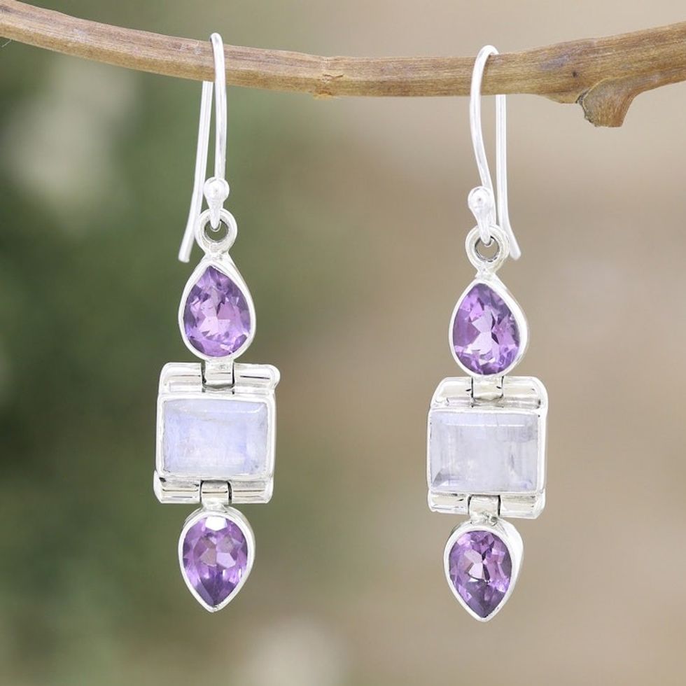6-Carat Amethyst and Rainbow Moonstone Dangle Earrings 'Purple Prophecies' Item ID: 2671786651