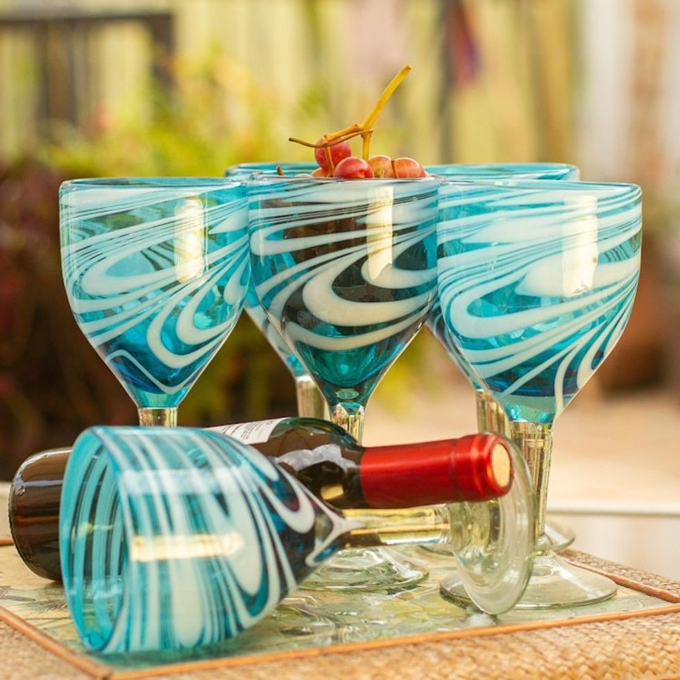 6 Hand Blown Wine Glasses in Aqua and White from Mexico 'Whirling Aquamarine' Item ID: 2669926807