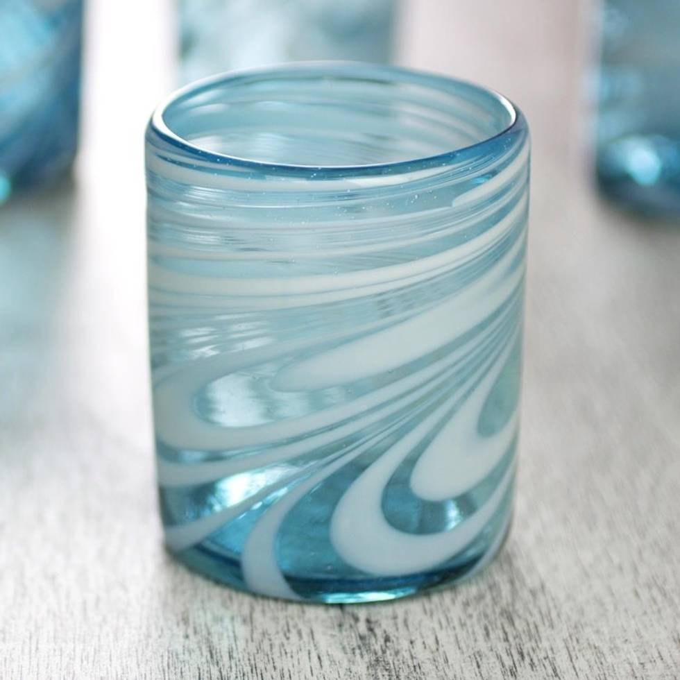 6 Mexican Hand Blown 11 oz Rock Glasses in Aqua and White 'Whirling Aquamarine' Item ID: 2669932417