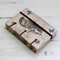 I collect journals, especially unique ones, and I also collect bird figurines in pottery, ceramic and glass and bird paintings. The kingfisher is one of my favorites because it is so colorful. Artisan Asha Prabha has done a masterful job with this handmade paper journal. The back cover reproduces an antique postcard.