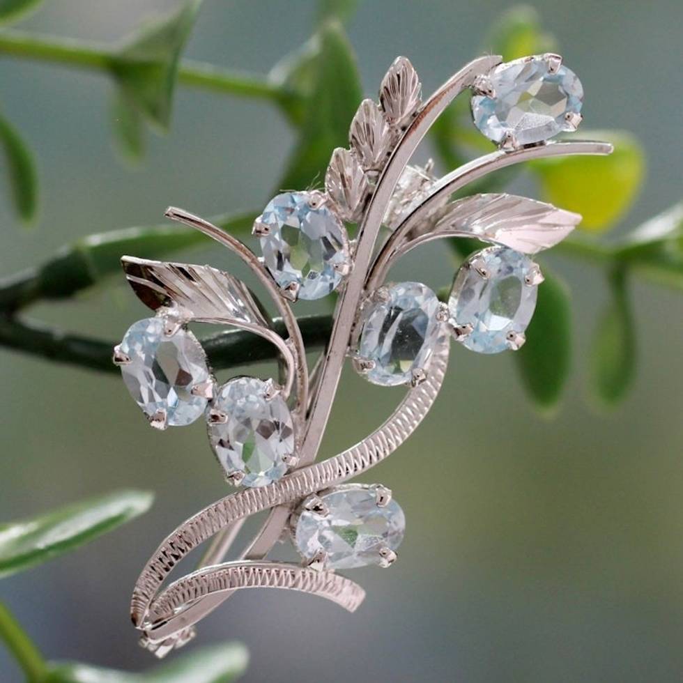 7 Carats Blue Topaz Sterling Silver Brooch Pin from India 'Blossoming Truth' Item ID: 2671793130