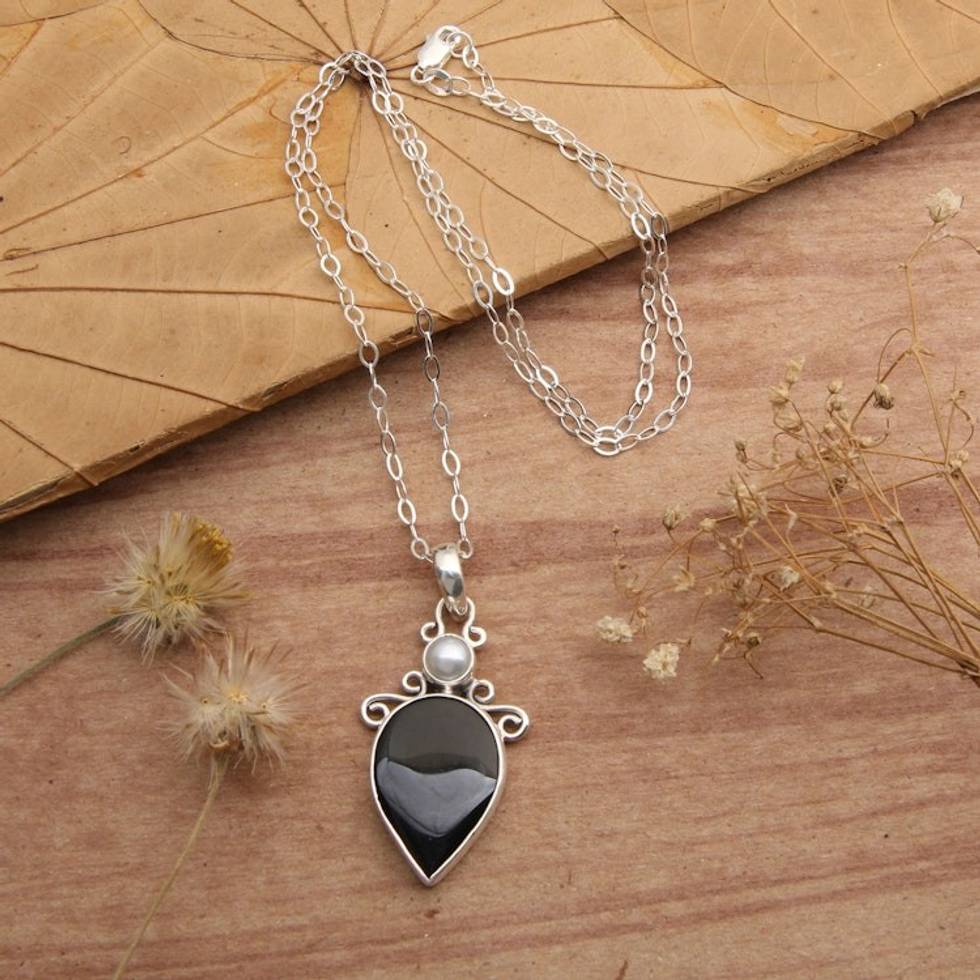 925 Silver Onyx Cultured Pearl Pendant Necklace from Bali 'Night and Day' Item ID: 2671764939