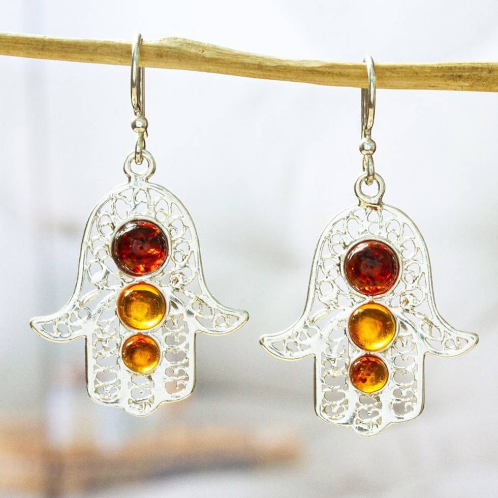 925 Sterling Silver and Amber Hamsa Dangle Earrings 'Warm Hand of Fatima' Item ID: 2669931121